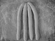 W ten sposób formujemy cztery wałeczki, które lekko oprószamy mąką (beda ładnie trzymały kształt w trakcie wyrastania i pieczenia) i zlepiamy z jednej strony: