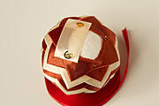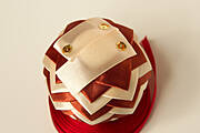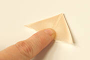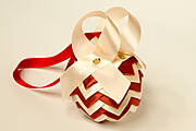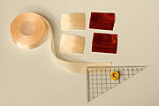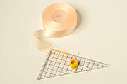 W miejscu, gdzie krzyżują się tasiemki, dokładnie na środku wbijamy ozdobną szpilkę. Tniemy lamówkę na fragmenty o długości dokładnie 5 cm, ewentualnie o kilka milimetrów dłuższe (długość nie może być krótsza niż szerokość lamówki przemnożona razy dwa). Zaginamy narożniki, aby powstał równoramienny trójkąt o ładnym ostrym wierzchołku.