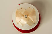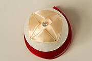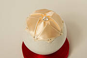 Lamówkę przypinamy szpilkami, ozdabiając je cekinami. Brzegi lamówki przycięte nożyczkami powinny zostać podwinięte pod spód. Za pomocą szpilek mocujemy zawieszkę z węższej lamówki.