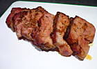 Cebulę i czosnek bardzo mocno siekamy lub trzemy na tarce. Do powstałej miazgi dodajemy resztę składników i dobrze ze sobą łączymy. Powstałą zaprawą smarujemy boczek i owijamy go w folię spożywczą lub aluminiową i dajemy na całą dobę w chłodne miejsce. Następnie boczek już bez folii układamy na brytfannie, podlewamy niewielką ilością wody i wstawiamy do nagrzanego do 140 piekarnika. W czasie pieczenia obracamy boczek kilka razy i podlewamy na zmianę raz łyżką wody, a raz wytworzonym w czasie pieczenia sosem. Gdy boczek zmięknie wyjmujemy go dajemy na półmisek. Gdy ostygnie zawijamy go w folię aluminiową i trzymamy w chłodnym miejscu. Podajemy pokrojony w cienkie plasterki z dodatkiem pikantnych sosów lub sałatki.
