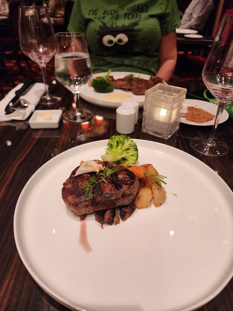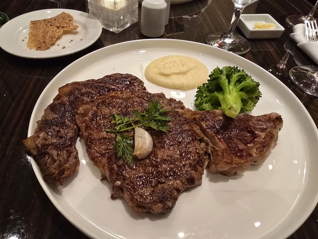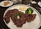 Danie główne to steki, mój ribeye, męża fille minion (polędwica), na deser ja miałam owoce i kulkę lodów (nie było w opisie), mąż sernik.